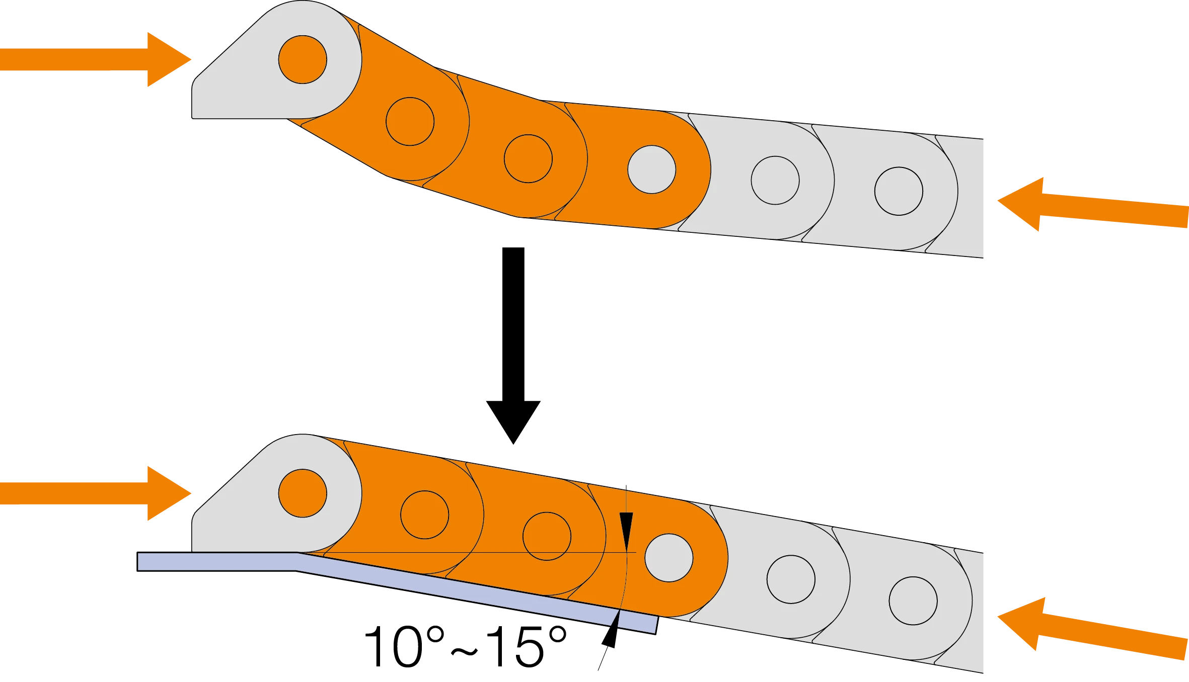我们建议按右图形式对移动端拖链进行支撑,以免链节过度受压致使意外断裂。支撑板坡度推荐10°~15°,并且至少能支撑3节拖链或全部反装链节。