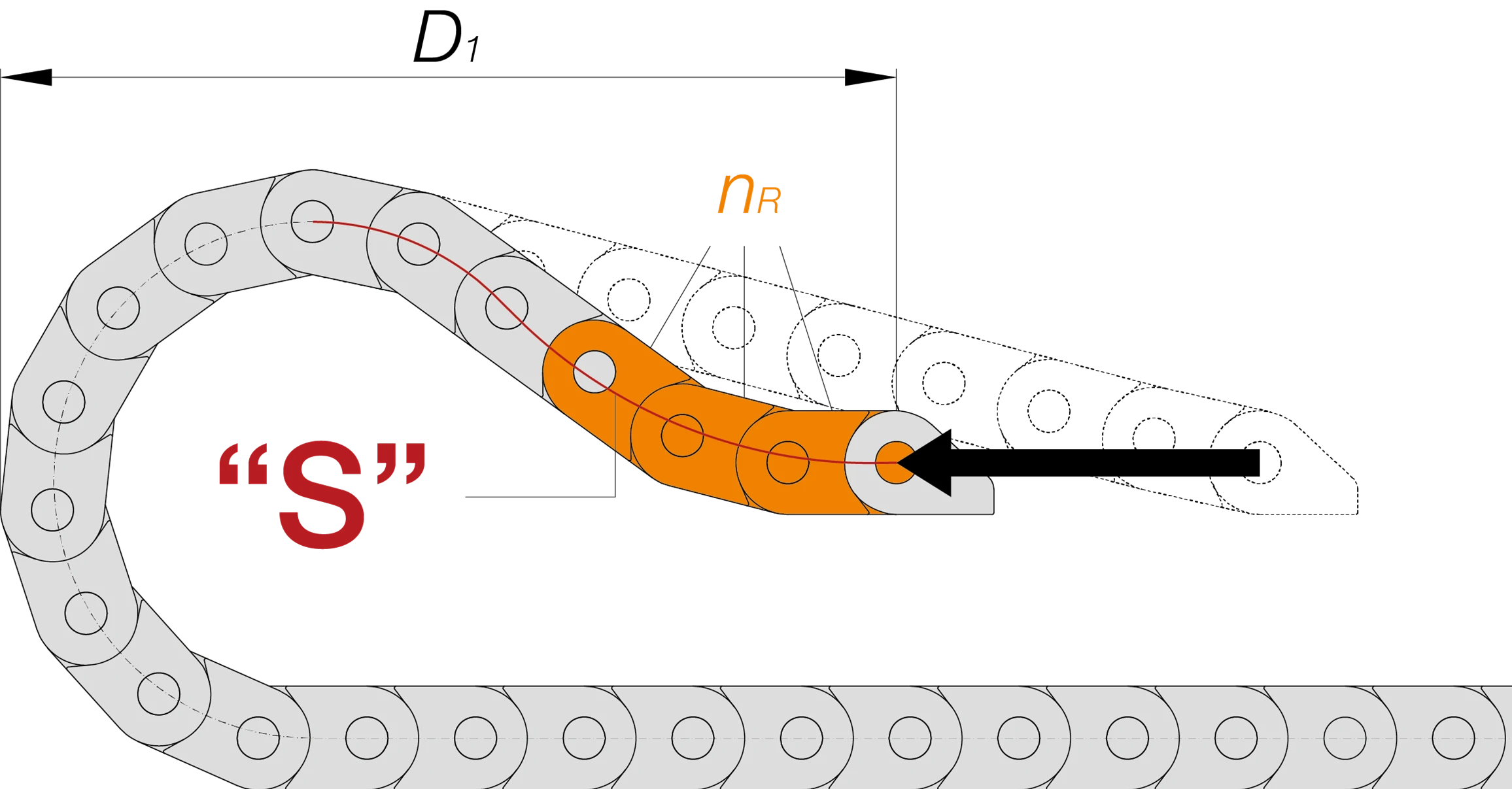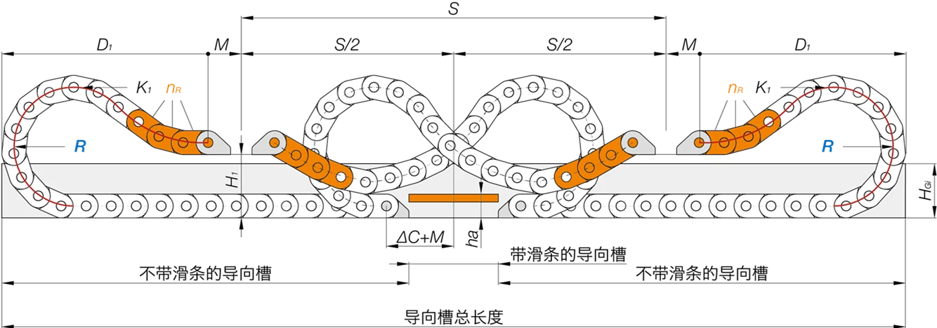 反装链节数nR取决于拖链类型及弯曲半径,可在每个系列的安装尺寸中查询。