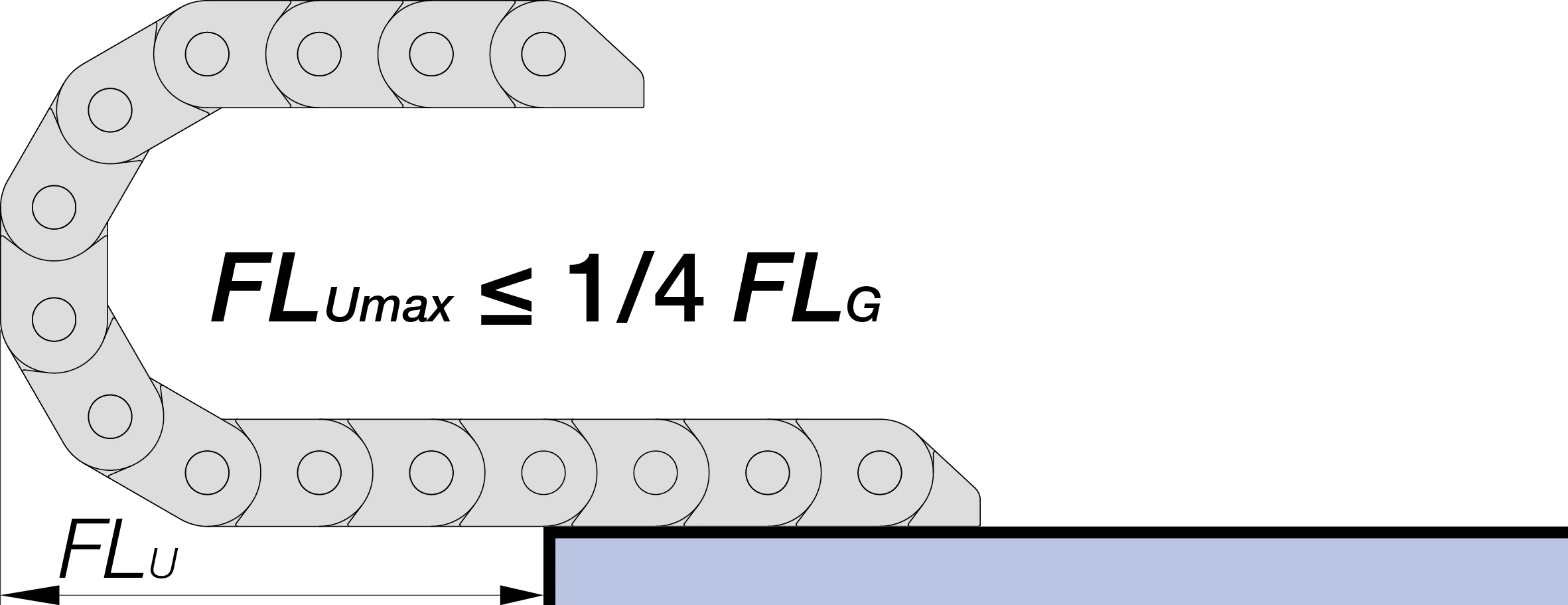 架空悬垂长度取决于拖链类型和内部负载,我们推荐最大悬垂长度FLUmax ≤ 1/4 FLG。