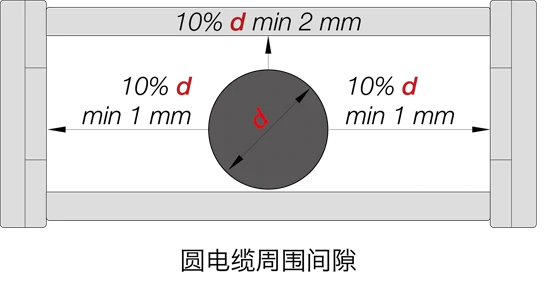 电缆和软管在拖链中必须能自由移动,因此必须保证管线周围留有一定间隙。