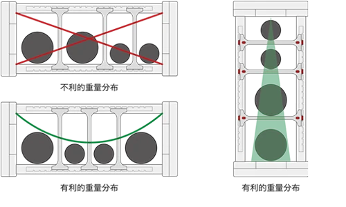 1. 当拖链水平安装时,请确保电缆和软管的重量沿宽度方向对称分布。否则,拖链一侧的磨损会加剧,导致拖链链节的孔轴间隙变大, 从而缩短拖链系统的使用寿命。重的管线布置在两侧,这样可以减轻拖链内应力。