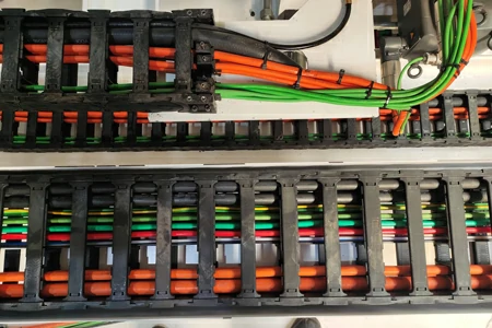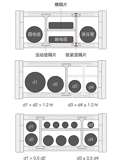 3. 两根扁电缆并排布置时应使用竖隔片分隔,叠放时应使用横隔片分隔。扁电缆和圆电缆在拖链内必须单独分开布置。