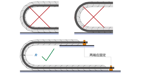 电缆和软管在拖链中必须有足够的自由空间,且在拖链弯曲半径处不受任何张力。