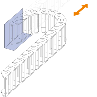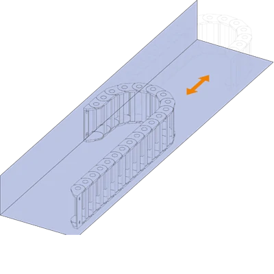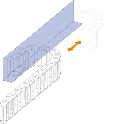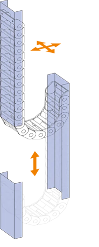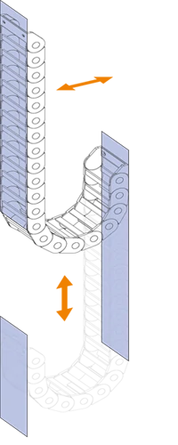 拖链可以在水平面上做旋转运动,也可以在竖直平面上做旋转运动。根据应用参数,可能需要配置导向支撑,请咨询我们。
