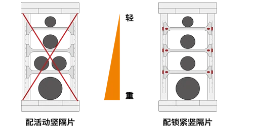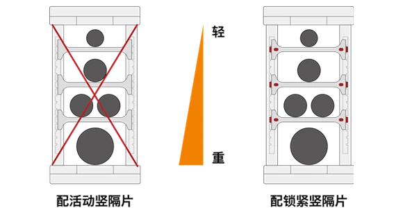 侧向安装时必须使用锁紧竖隔片,活动竖隔片受重后会压缩管线自由活动空间,增加磨损。