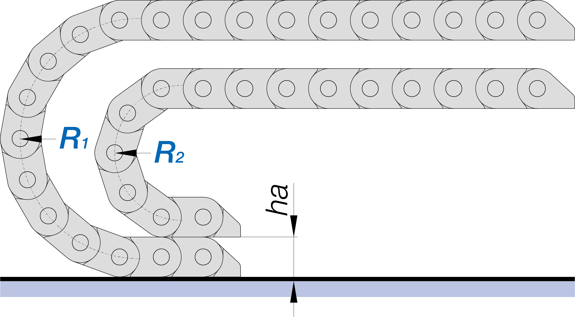 为了保证拖链运行顺畅,嵌套拖链之间必须留有一定间隙。我们推荐相邻拖链的弯曲半径差值:R1 - R2 > 3/2 ha