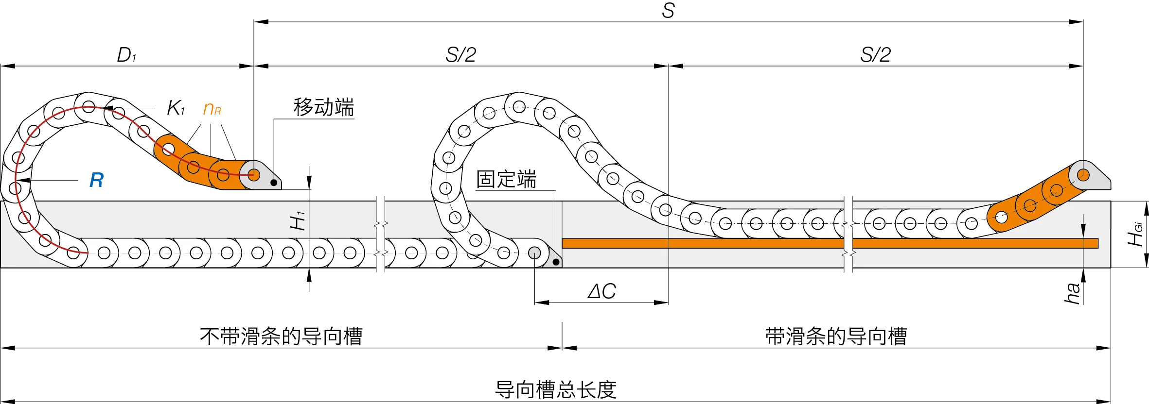 滑行::拖链的上段一部分在下段拖链上滑行,另一部分在等高的滑条上滑行。