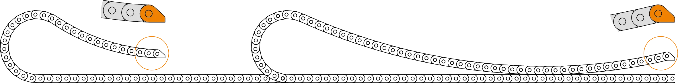 所有LONGO标准拖链都带有预应力。预应力可以增加拖链的架空长度,延长使用寿命。