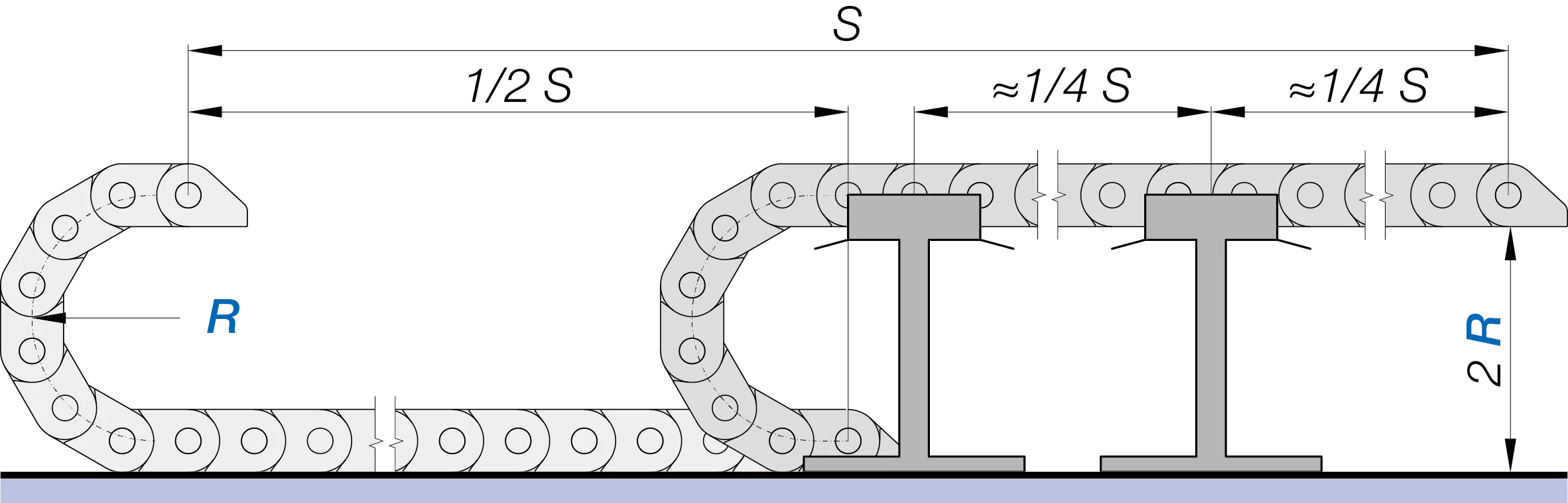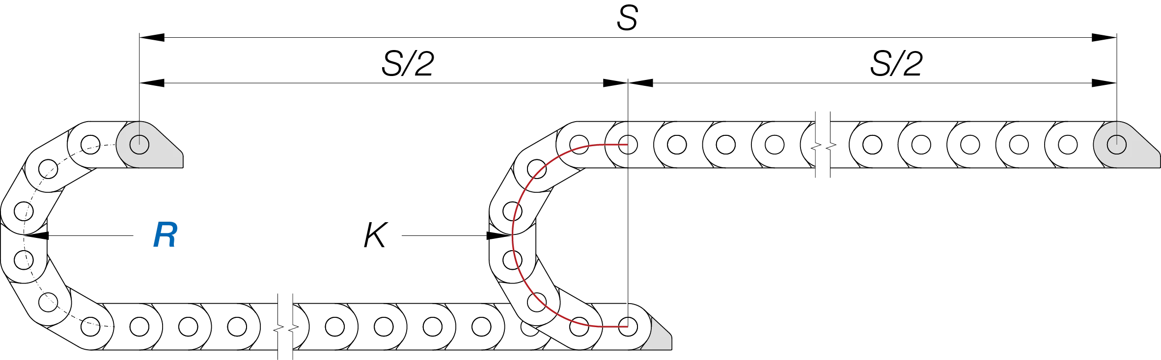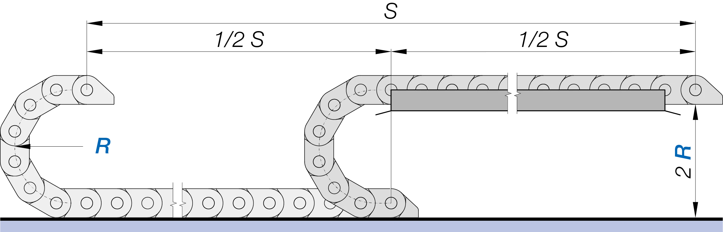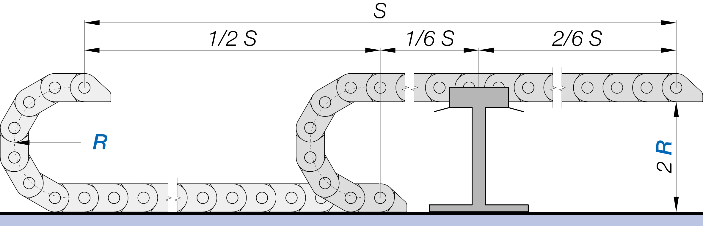我们推荐将拖链固定端安装在行程中点,此时所需拖链、电缆及软管长度最短,成本最低。