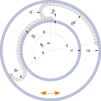 通过一种双向弯曲的拖链(RBR),可以实现一个平面内的旋转运动。RBR拖链可以沿外轨道或内轨道旋转一定角度,最多可达540°及以上。