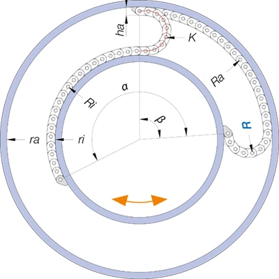 固定端角度β = α * Ra / (Ri + Ra)时,拖链最短