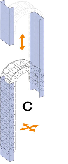 如果在竖直运动中存在横向加速度,则必须安装横向支撑。横向支撑可以部分布置,但至少在拖链可能摇摆处需要安装支撑。优选图C方案。